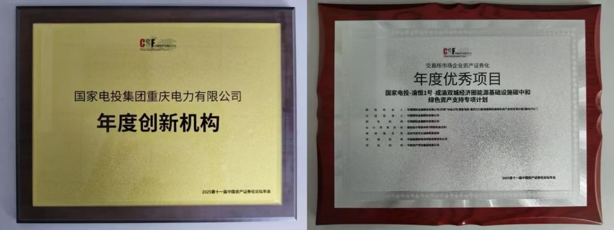 近日,第十一届中国资产证券化论坛(CSF)年会在京举行,国家电投集团重庆公司凭借在清洁能源转型领域的卓越成果与金融创新实践,从众多参评机构中脱颖而出,获得“2025年度创新机构”和“交易所市场企业资产证券化年度优秀项目(江口水电类REITs续作项目)”两项行业大奖。