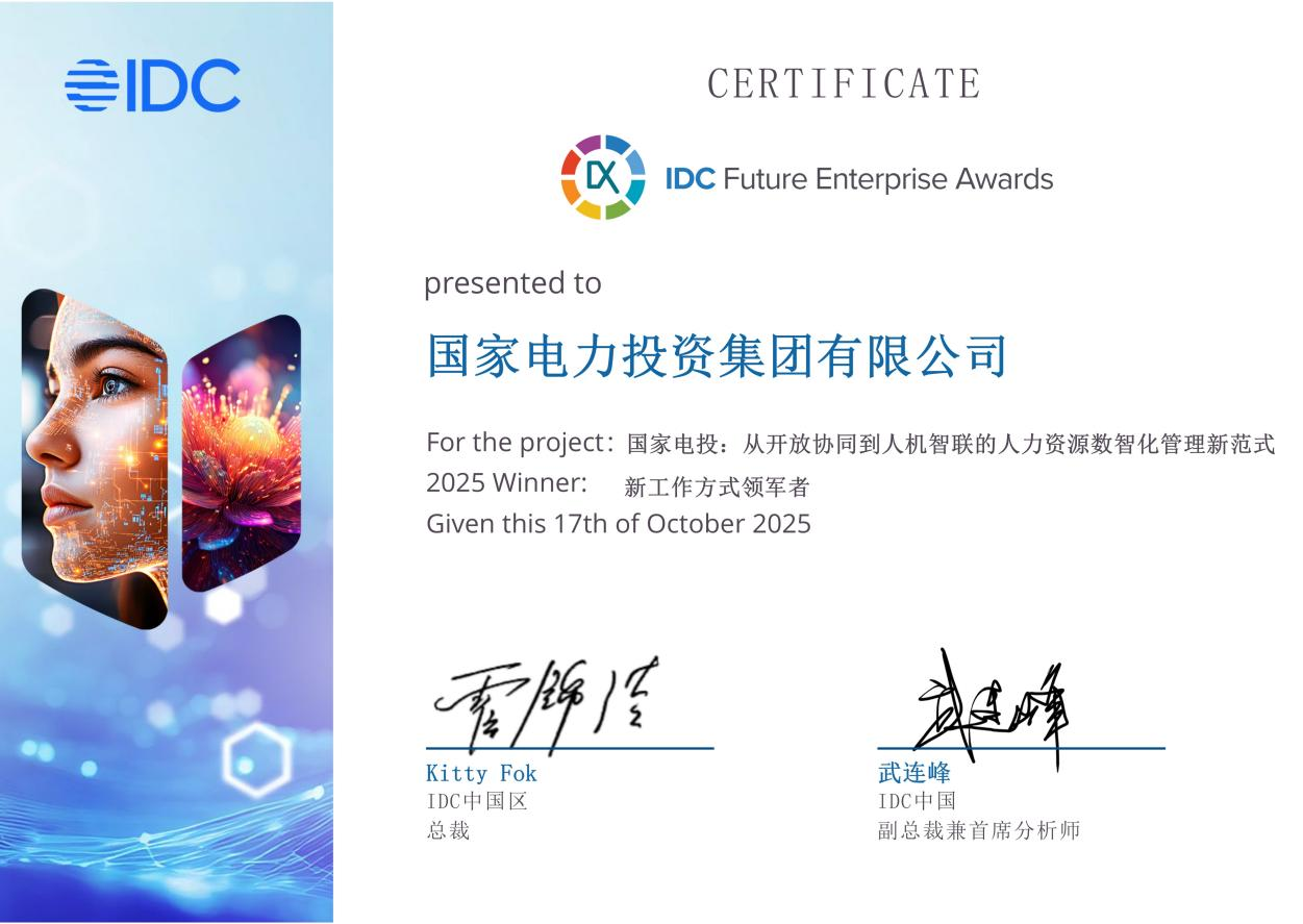 10月17日,全球权威IT市场研究和咨询公司国际数据公司(简称IDC)公布了“2025 IDC中国未来企业大奖”优秀奖获奖名单。国家电投集团智慧人力资源管理系统(AHR系统)凭借在“AI+HR场景”深度融合方面的卓越实践,获“IDC中国未来企业—新工作方式领军者优秀奖”。
