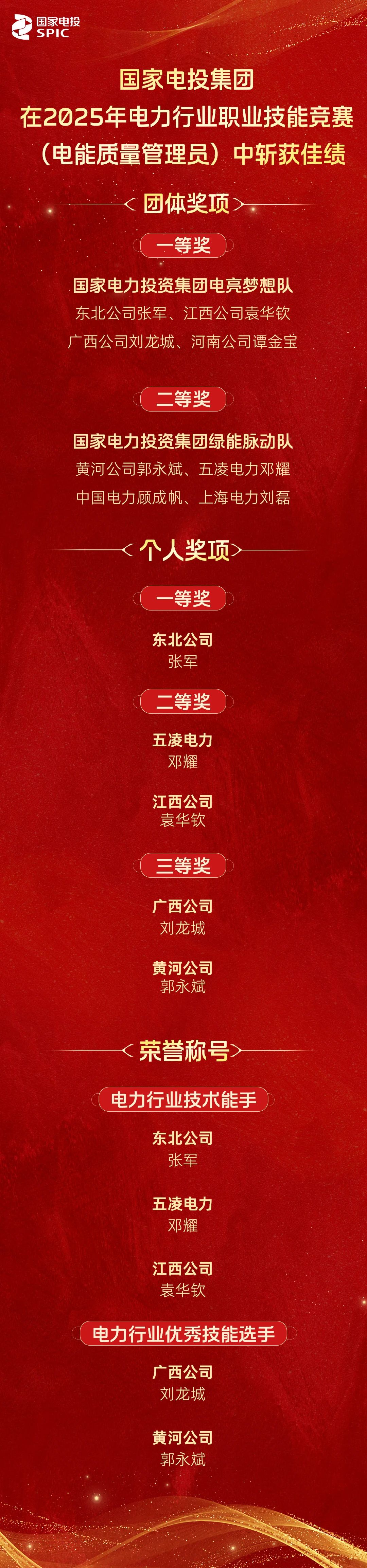 这些佳绩的背后是选手们的刻苦钻研与团队的精诚协作他们专注打磨技艺用协作铸就佳绩为国家电投人树立标杆让我们以他们为榜样沉下心钻研业务,铆足劲提升本领共同为国家电投集团高质量发展注入源源不断的动力。