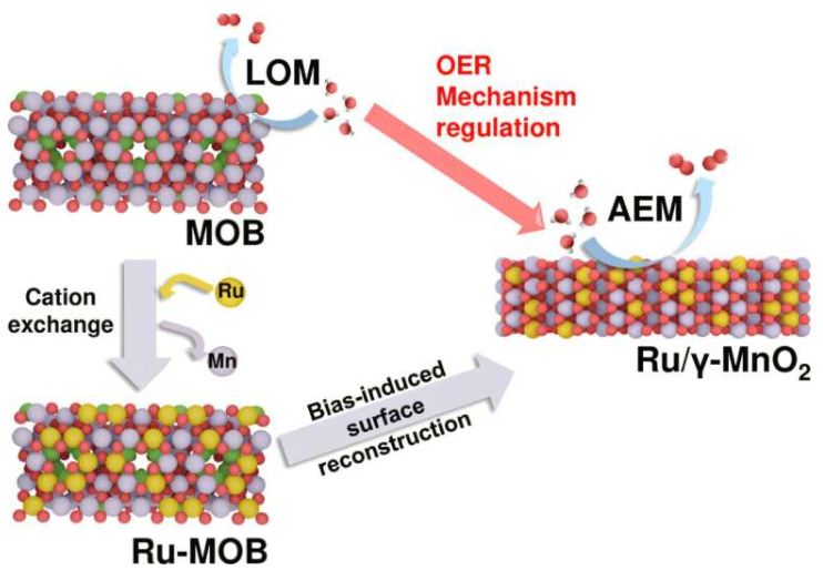 研究团队提出的解决方案是一种新型复合催化剂。该催化剂由分散在氧溴化锰微颗粒上的单个钌原子构成。在电解过程中,催化剂表面能自发“动态重构”,形成一层极薄的保护层。这层保护膜如同皮肤,既能有效保护催化剂核心结构免受强酸性环境的腐蚀,又能维持其高催化活性,从而实现长期稳定、高效地产氧。